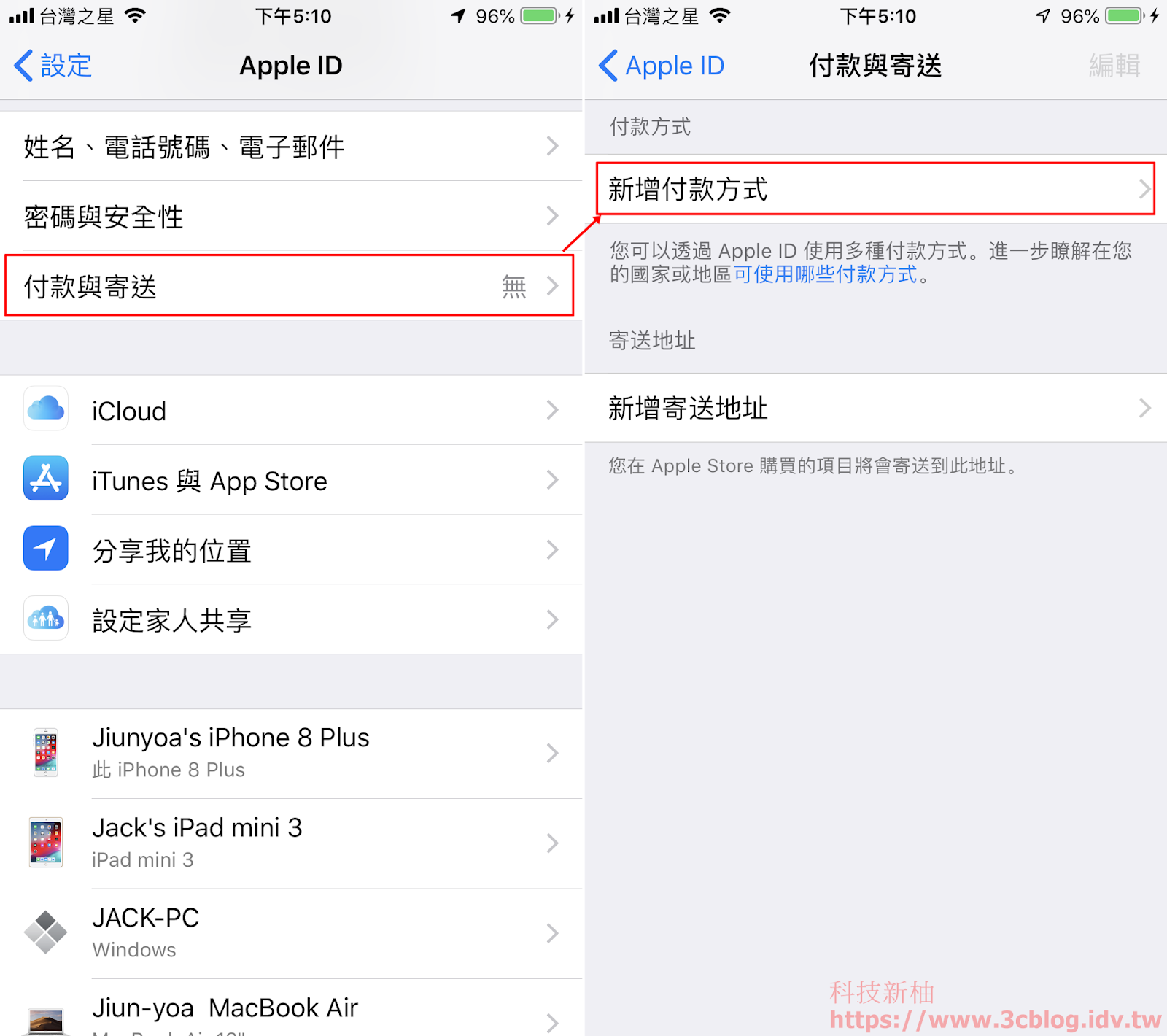 ▲ 打開裝置的設定,然後點最上面的 Apple ID 帳號,會看到 「付款與寄送」(如圖左),接著選擇 「新增付款方式」(如圖右)。