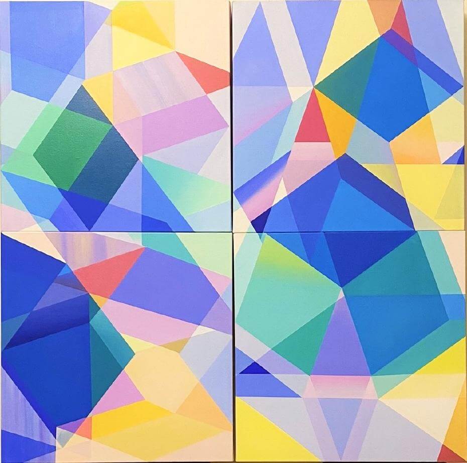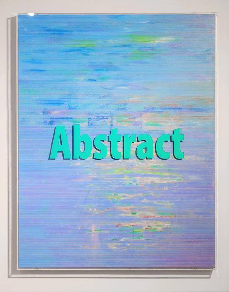 范姜明道這一系列的繪畫,最初先以豐富的色彩打底,再鋪陳一層均質顏料形成層次。接著運用木工用的彈線,在奔放的畫面中建立了度量機制。作品運用的壓克力框並非只是裝裱,而是先以雷射切割刻出「Abstract」凹槽,再填入單色的顏料。在多重的視覺語言中,反覆地闡述著對於抽象的體悟。