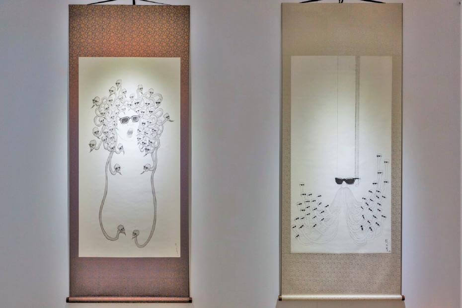 彭弘智,(左)《Medusa》,畫面 135x69cm 捲軸201x85cm,2018 / (右)《鬍仙 Beard God》,畫面 133x68 捲軸201x85cm,2003,紙 墨 捲軸。圖/問空間提供
