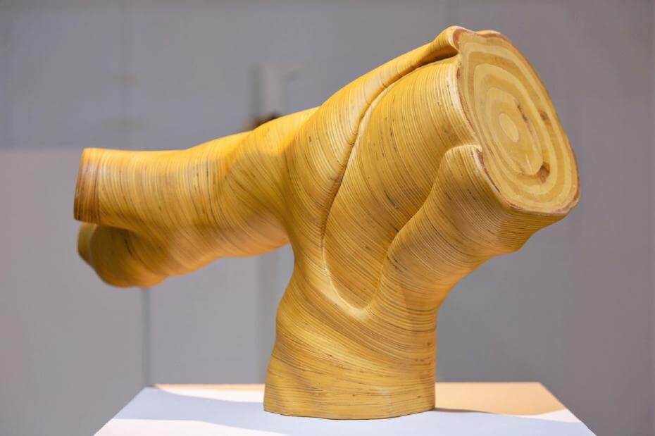 展覽中范姜明道也帶來了十多年前的木雕作品。以「將樹木變成其本身的紀念碑」為設想,將大量的合成木板膠合之後,重新塑造回樹木(或湖石)的造型。在全立體的作品上,材質的直線與造型的曲線也呼應著測量抽象的概念。藉由木材的再回復,重新思考物質、造型和象徵性的關係。