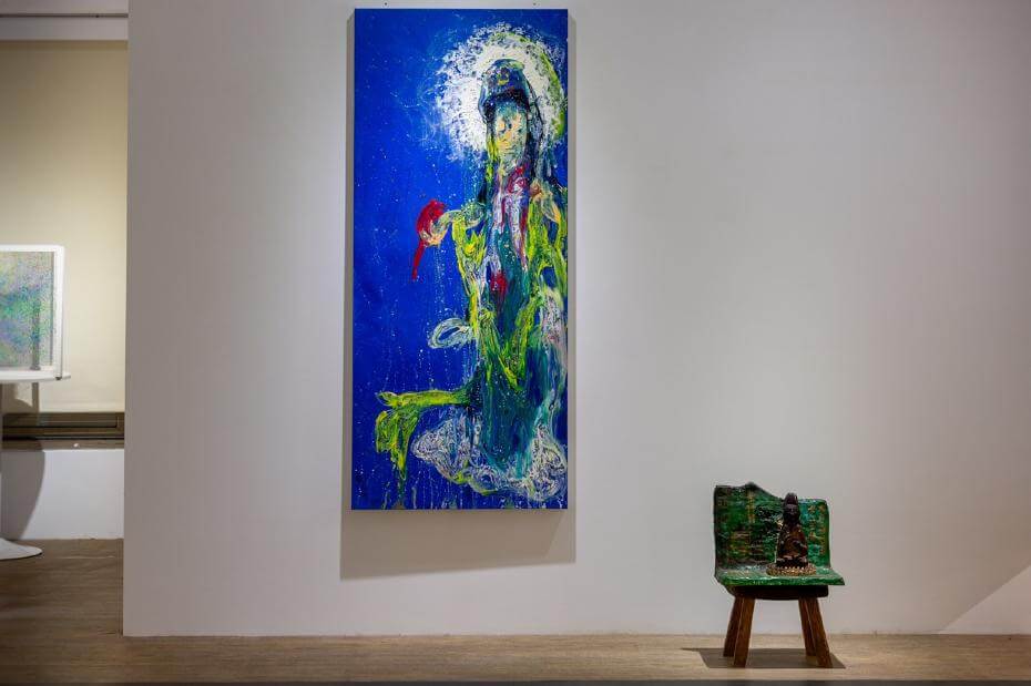 彭弘智,《落難觀音》,依場地調整,2022,油畫 撿到的石頭觀音像 木椅。圖/問空間提供