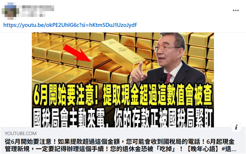 網傳「從 6 月開始要注意」、「如果提款超過這個金額,您可能會收到國稅局的電話」的訊息和影片。經查證,發布傳言影片的 YouTube 頻道並非具有可信度的資訊來源,且其敘述模糊不清,內容含有許多錯誤訊息。目前民眾至金融機構辦理 50 萬元以上的交易須申報,但這是行之有年的規定,近期並沒有改變;而關於家人之間給予大額現金可能產生的稅務問題,根據贈與稅法規定,贈與稅免稅額為一年 244 萬,贈與人在同一個年度內,累計贈與給他人的財產總額不超過此金額就可以免辦贈與稅申報。