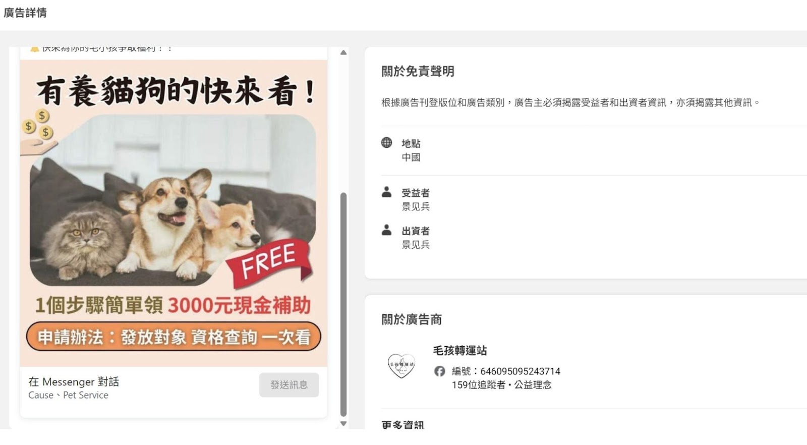 根據 Meta 的廣告政策,在 Facebook 上投放廣告需揭露受益者及出資者資訊,「毛孩轉運站」廣告的受益及出資者皆為「景见兵」,地點定位則是在「中國」。