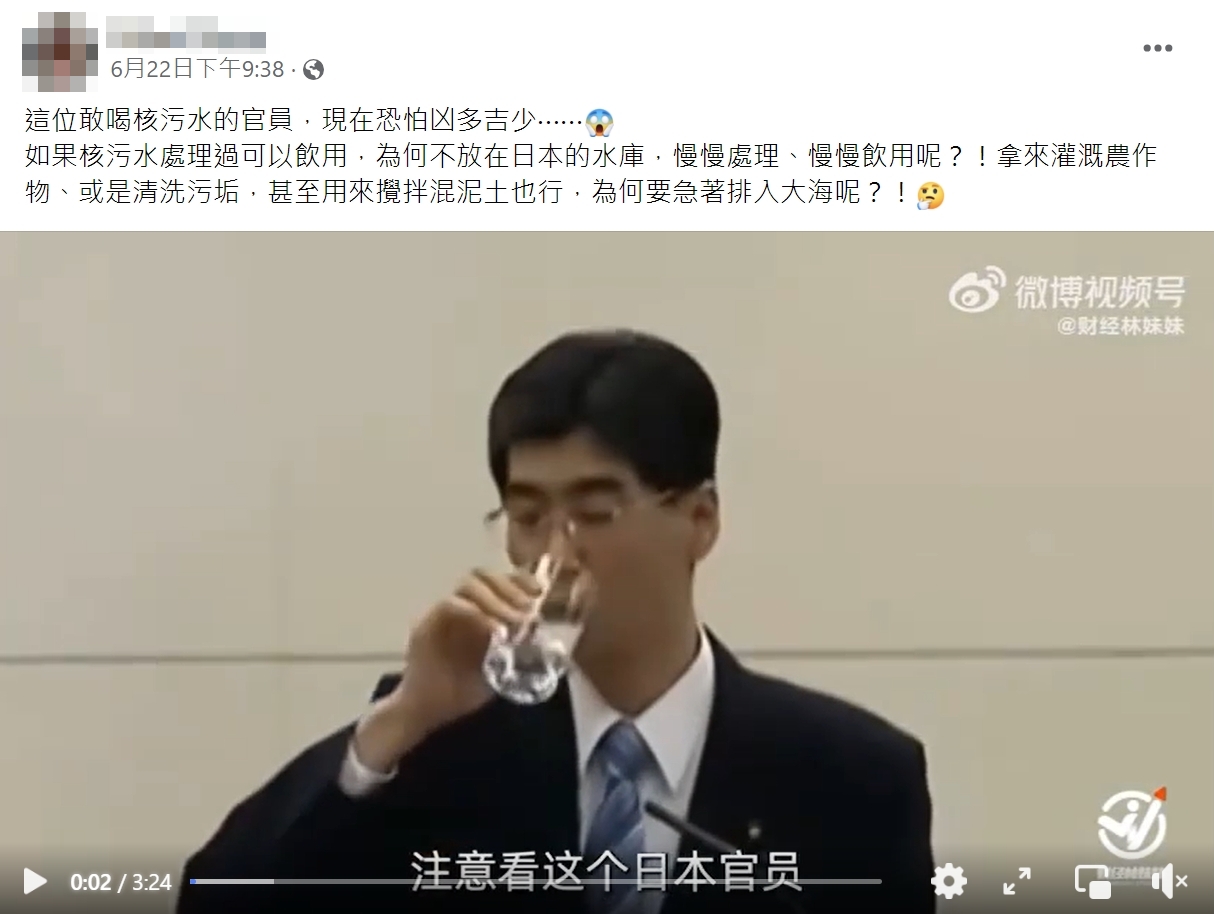 【錯誤】日本的核廢水要運到台灣來?官員說可以喝?虛構描述的影片貼文