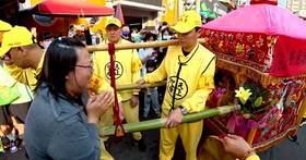 今(14)日白沙屯媽祖進香活動來到第二天,上午「粉紅超跑」行經至台中大肚零售市場,一名婦人雙手合十、面容十分焦急地向媽祖祈禱,正當媽祖鑾轎準備離開時,竟突然停下來並轉彎,神鑾轎持續晃動了一會後,竟神奇的向這名婦人的方向前進,最後停在婦人的面前,讓這名婦人情緒相當激動,當場落淚。