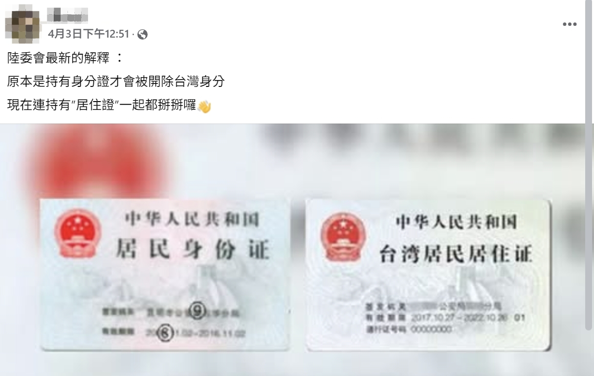 陸委會宣布:擁有中國身分證、定居證(居住證),將失去台灣身分證!