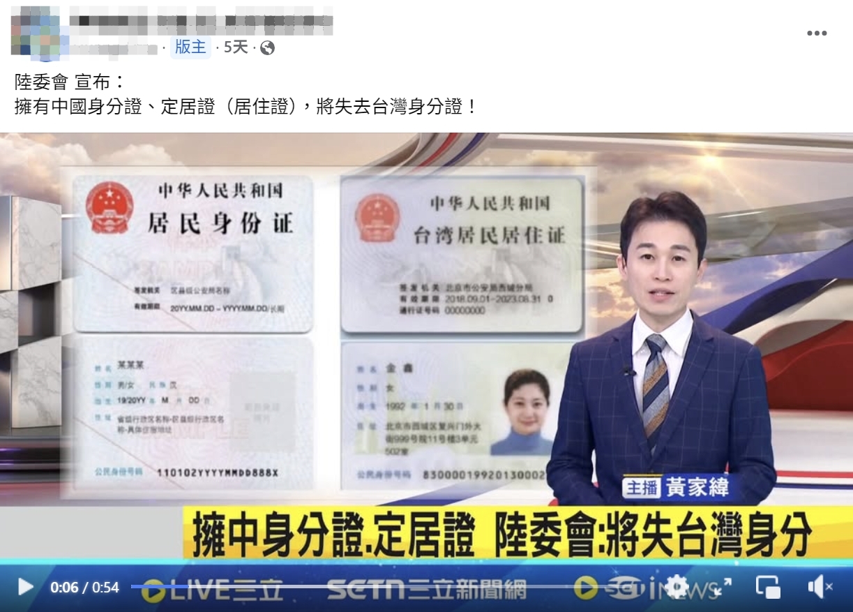 網傳「持有居住證會喪失台灣身分」的影片及訊息,內容聲稱陸委會最新公布的令釋,提到持有中國身分證、定居證(居住證),將失去台灣身分。經查證,令釋提及的「定居證」,全稱為「台灣居民定居證」,該證可向中國定居地的公安機關設戶籍與申領身分證,台灣人持有將喪失台灣身分;「居住證」的全稱則為「中華人民共和國臺灣居民居住證」,該證並不能在中國申請戶籍或釋身分證,台灣人持有不會喪失台灣身分,亦不在陸委會此次的令釋規範內。網傳訊息將「定居證」與「居住證」混為一談,且部分媒體報導時搭配錯誤配圖,易造成民眾誤解。