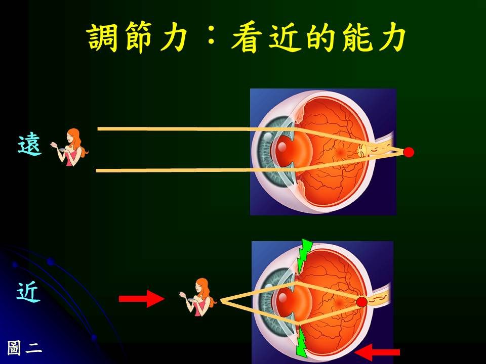 (2)原因在於人類的眼睛就像一個變焦鏡頭,隨時可以改變焦距,但年紀增加、水晶體也減少彈性,造成調節能力下降,當剩餘的調節幅度沒辦法輕鬆看近或閱讀書報時,就稱為老花眼。