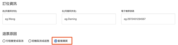自2017/03/01起,重複購買之退票申請,僅接受兩張機票全程航段「搭乘航點、搭乘日期、航班班號、訂位艙等代碼(RBD)、機票姓名拼音及稱謂 完全相同」之機票退票。未符合重複購買條件之退票申請,依機票規定收取相關退票手續費
