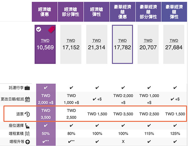 例如,你在訂購時,會看到經濟艙優惠、經濟艙部份彈性、經濟艙彈性,其實這裡不同的票價其實就是代表它背後的艙等是不同