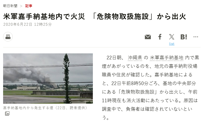 朝日新聞 - 米軍嘉手納基地内で火災 「危険物取扱施設」から出火