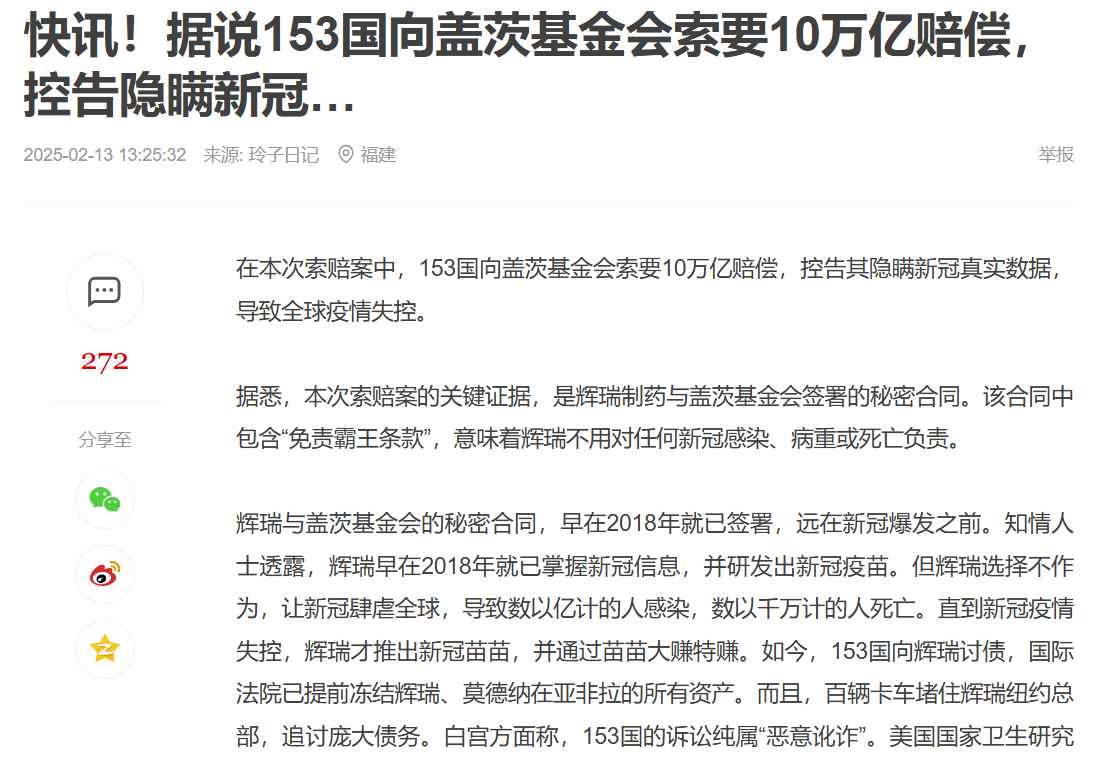 網傳「153 國向蓋茲基金會索取 10 萬億賠償,控告隱瞞新冠」的影片。經查證,傳言影片的內容為錯誤訊息,不存在 153 國針對 COVID-19 疫情或疫苗問題聯合向比爾蓋茲基金會索賠的事件,國際法院也沒有凍結輝瑞和莫德納的資產;而傳言中宣稱疫苗製造商在合約中有出事不用負責的霸王條款,其敘述也並不正確,疫苗製造商會有法律豁免權是為了鼓勵研發疫苗、避免因為訴訟風險而影響到公共健康,但這並不代表如果有民眾在接種疫苗後發生嚴重副作用就無法獲得補償,各國均有相關的藥害救濟管道。