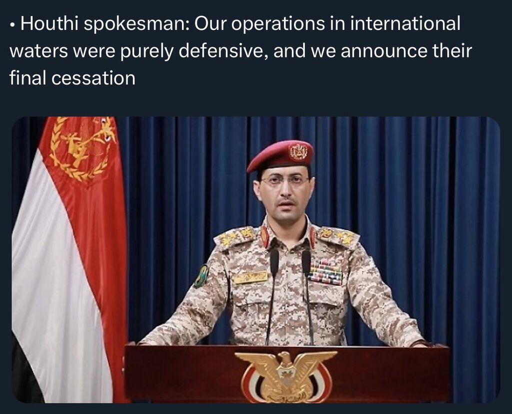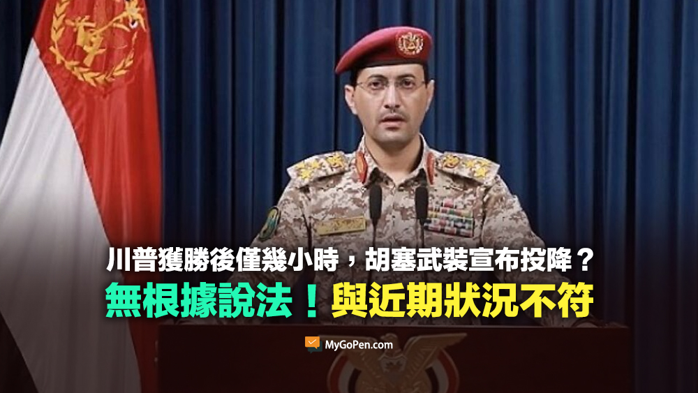 網傳「川普獲勝後僅幾小時,胡塞武裝宣布投降」的訊息和圖片。經查證,傳言圖片中的人確實和胡塞組織有關,是胡塞組織的官方發言人 Yahya Saree(العميد يحيى سريع),他代表組織對外表態時的畫面都是身穿軍服、以藍色布幕及紅白黑旗幟為背景;但傳言說法是錯誤訊息,目前胡塞組織並沒有任何宣布投降的訊息,並宣布會繼續海上及陸上的行動,近日甚至以高超音速彈道飛彈攻擊以色列軍事基地。
