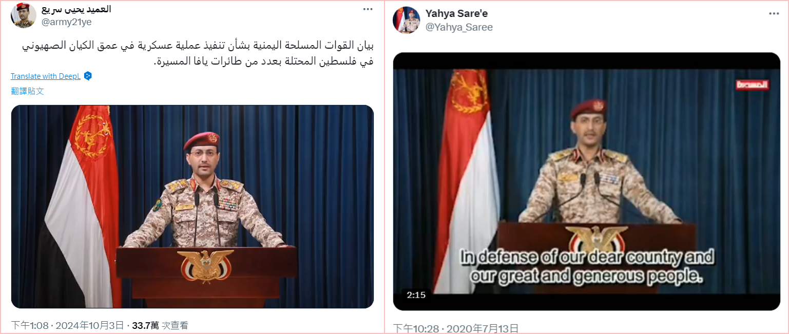 (三)將網傳圖片反搜,查找到此人為胡塞組織的官方發言人 Yahya Saree(العميد يحيى سريع),在他的阿拉伯文 X 平台帳號和英文 X 平台帳號裡可以看到他對外發言的影片,畫面都和網傳圖片一樣身穿軍服、背景為深藍色布幕,前方有講台、左方有旗幟,因此無法確認傳言圖片是出自什麼時候。