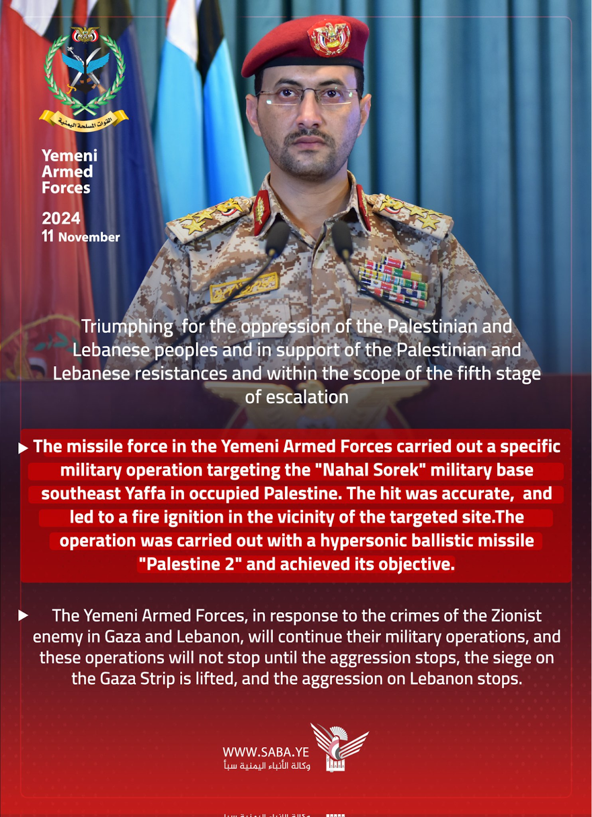 (二)至本篇查核報告截稿前,都沒有胡塞組織宣布投降的訊息,且根據胡塞組織官方發布的最新聲明,他們近日還進行了一項軍事行動,使用「巴勒斯坦 2」高超音速彈道飛彈攻擊以色列的軍事基地「Nahal Sorek」,成功命中並讓目標地點附近起火。