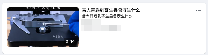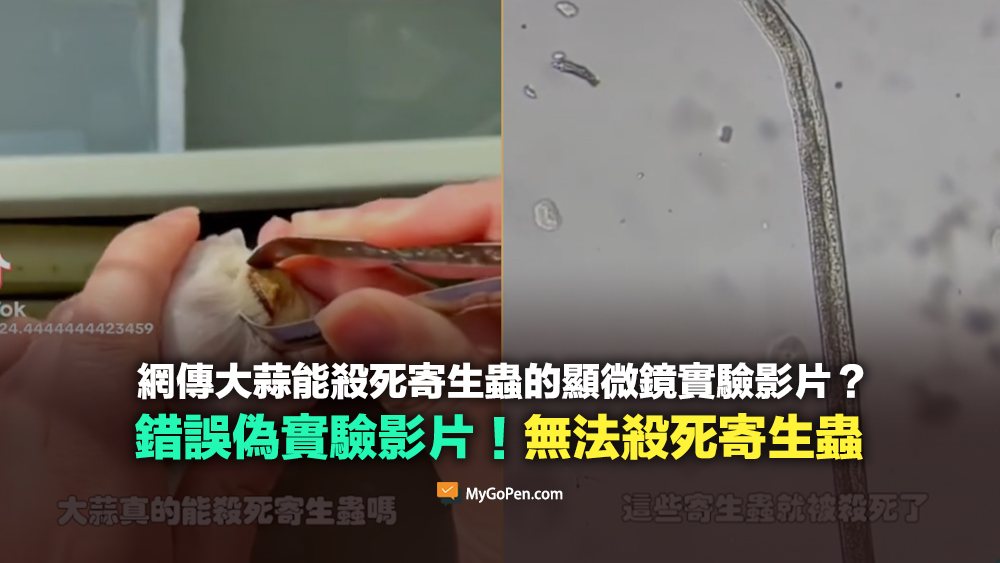 網傳短影片中,提到國外的科研發現大蒜真的能殺死寄生蟲,因為蒜素能破壞寄生蟲的細胞膜,在顯微鏡底下、幾秒鐘寄生蟲就死了。但 MyGoPen 查詢 PubMed 上曾在國際上發表的相關研究,確實查到「吸蟲的外皮結構發生相當大變化,腫脹、皺褶、空泡化」,類似於傳言所說的破壞細胞膜、細胞結構等說法,但該論文的小鼠實驗結果為「實驗組與對照組相比,吸蟲的恢復力、繁殖力和局部細胞激素表現並沒有差異」,與傳言說法完全不同,傳言套用國際研究部分內容、再拼接上自己的錯誤結論,傳言為錯誤訊息。