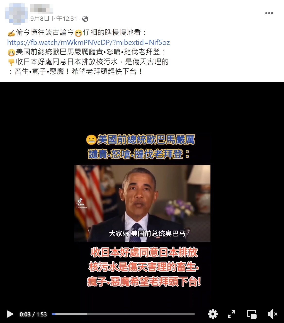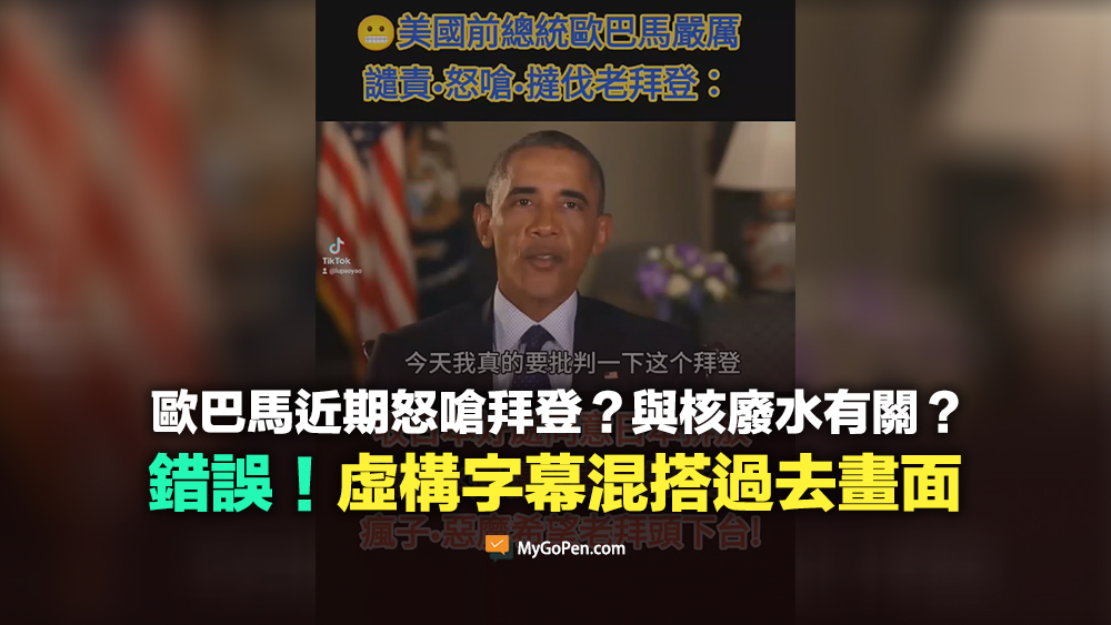 網傳「歐巴馬嚴厲譴責拜登」的影片及訊息,內容聲稱美國前總統歐巴馬近期發表談話,怒批拜登放任日本排放福島核處理水,要求他下台。經查證,網傳歐巴馬演說片段最初來自抖音,而後經過加工在 TioTok 、臉書等平台流傳;該片段是歐巴馬於 2017 年 1 月發表的談話,主要說明總統告別演說的內容,傳言將虛構的字幕與舊影片結合,試圖混淆視聽,實際內容與日本排放福島核處理水或拜登完全無關,網傳訊息不正確。