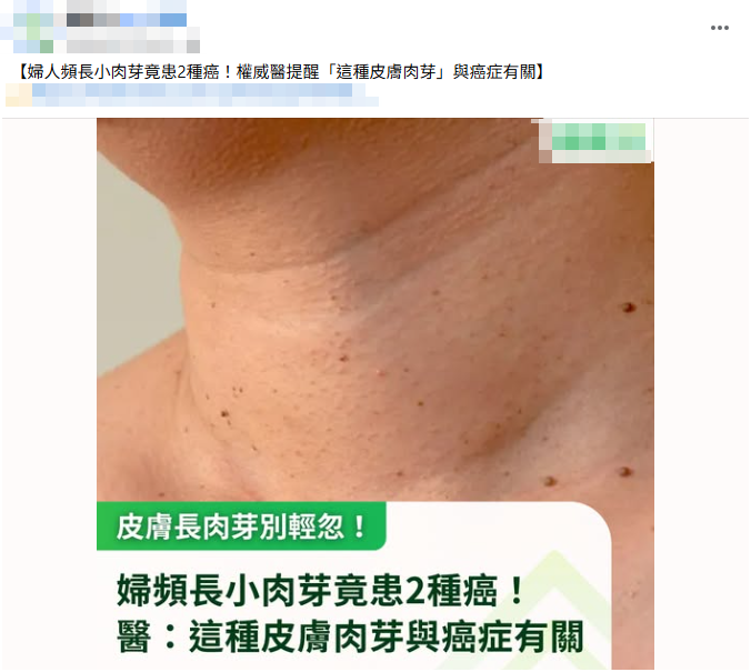 網傳「婦人頻長小肉芽竟患 2 種癌症!權威醫提醒這種皮膚肉芽與癌症有關」貼文,提到皮贅可能是 PTEN 基因缺陷、癌症的訊號。但專家表示,臨床上最常見的皮贅病患是糖尿病患、肥胖症患者,這些人未必都是癌症體質、癌症傾向,而癌症家族史、癌症體質幾乎人人都有,也未必都是 PTEN 基因缺陷,傳言只強調皮贅與癌症之間的關聯性,但缺乏完整的背景知識、脈絡細節,傳言說法易造成誤解。