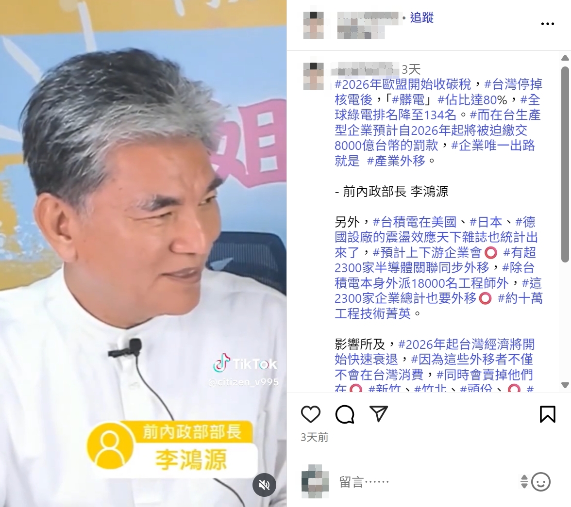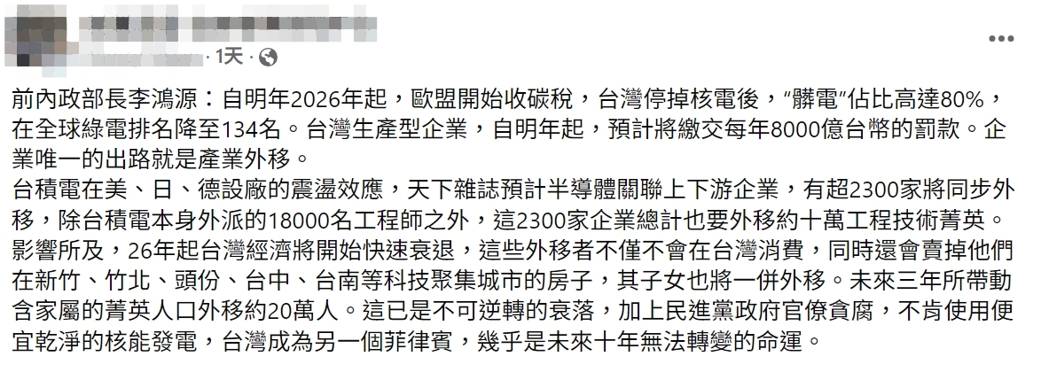 前內政部長李鴻源表示,自明(26)年起,歐盟開始收碳稅,台灣停掉核電後,“髒電”佔比達80%,在全球綠電排名降至134名。而在台生產型企業,自明年起,預計將繳交每年8000億台幣的罰款。企業唯一的出路就是產業外移。 另外,台積電在美、日、德設廠的震盪效應,天下雜誌也統計出來,預計半導體關聯上下游企業,有超2300家將同步外移,除台積電本身外派的18000名工程師之外,這2300家企業總計也要外移約十萬工程技術菁英。 影響所及,26年起台灣經濟將開始快速衰退,這些外移者不僅不會在台灣消費,同時還會賣掉他們在新竹、竹北、頭份、台中、台南等科技聚集城市的房子,其子女也將一併外移。因此未來三年所帶動含家屬的菁英人口外移約20萬人。 李鴻源悲觀表示,這已是不可逆轉的衰落,加上官僚貪腐,台灣成為另一個菲律賓,幾乎是未來十年無法轉變的命運。