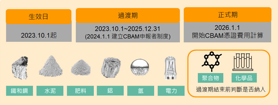 依照 SGS 台灣檢驗科技整理的《歐盟碳邊境調整機制》一文,目前受 CBAM 涵蓋的產品有鋼鐵、水泥、肥料、鋁、氫及電力,2023 年 10 月 1 日至 2025 年 12 月 31 日屬於過渡期,業者須每季申報一次,提交申報資料不需經第三方查證;2026 年 1 月 1 日正式施行後,業者改每年申報一次,提交申報資料需經第三方查證,也要繳交 CBAM 憑證。