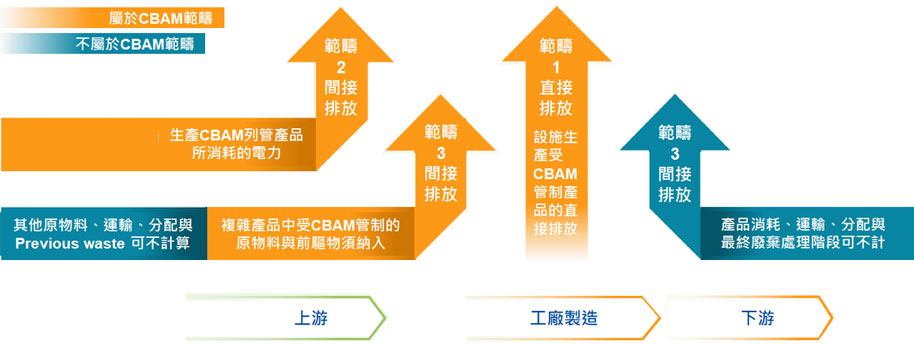 CBAM 要求申報的產品碳含量範疇包括:產品於廠內製程之直接排放(範疇一)、產品製程相關用電之間接排放(範疇二)以及產品中受 CBAM 列管的原物料與前驅物之排放(範疇三)。