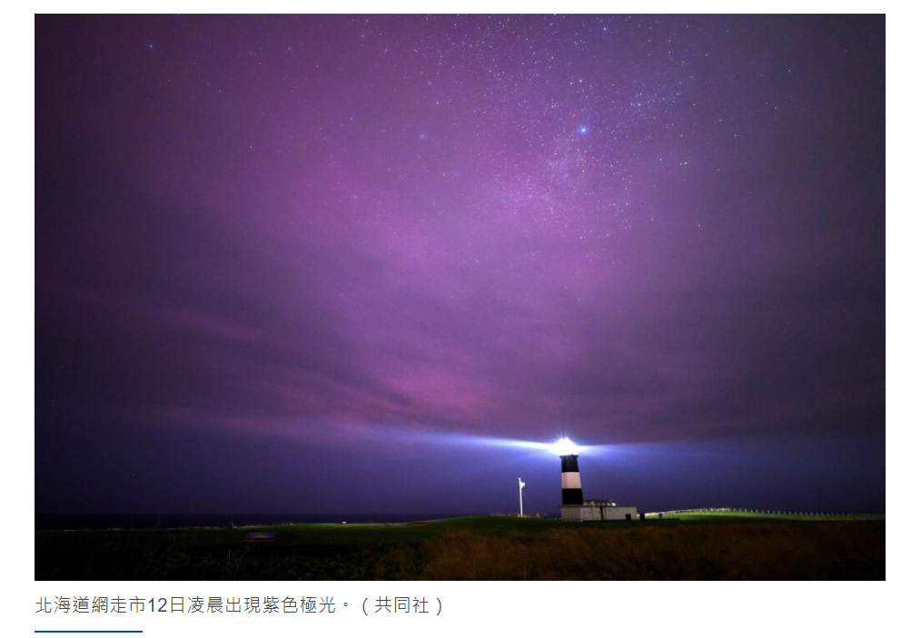 根據當地拍攝到的照片來看,北海道近日出現的低緯度極光以紫色為主,從 5 月 11 日晚間 7 時開始,一直持續到 5 月 12 日凌晨。