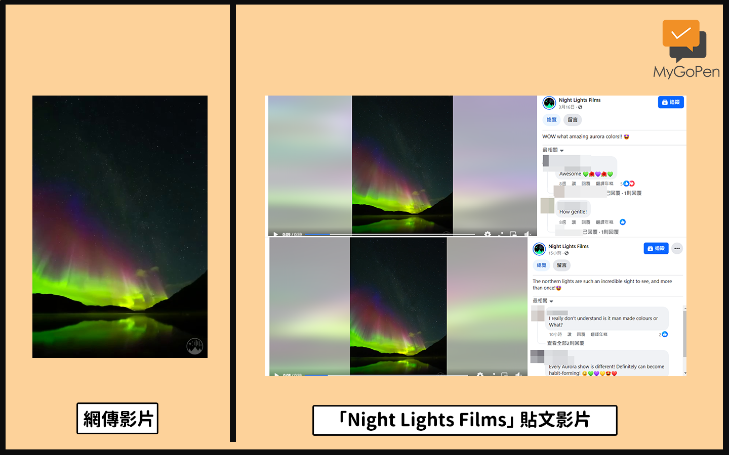 貼文指出,這是前一晚(2023/10/22)在挪威馬蘭恩峽灣(Malangen)所拍攝到的極光;雖然貼文照片中的 logo 和網傳影片不同,但「Night Lights Films」粉絲專頁的大頭貼正是網傳影片的 logo。