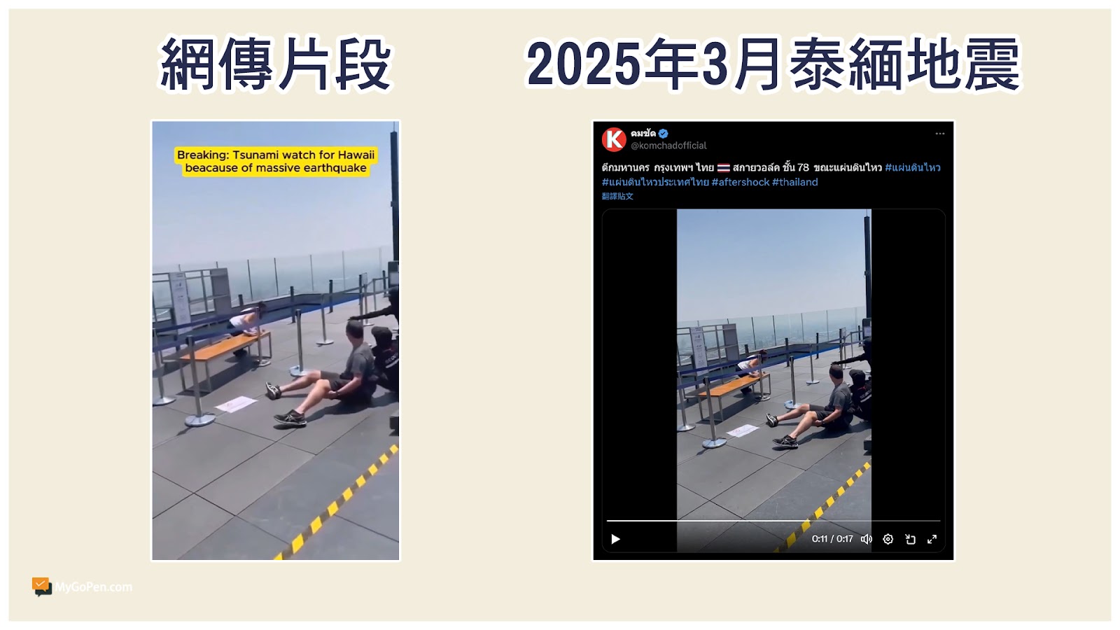 利用 Google Lens 進行反搜,可以找到影像網站Newsflare 上傳的影片,內容提到泰國民眾於 2025 年 3 月 28 日強震期間,拍下單軌電車(BTS)空車廂在月台劇烈搖晃的畫面,經檢視後確認與網傳片段相同,可以得知片段三同樣是來自泰國。