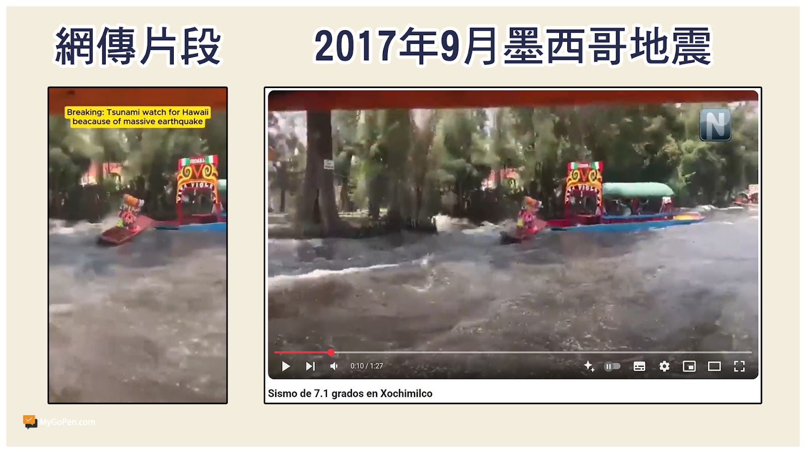 利用 Google Lens 進行反搜,可以找到 YouTube 頻道「Antonio Tello - NTV+」於 2017 年 9 月 20 日發布的影片,內容提到墨西哥發生強震,遊客在霍奇米爾科(Xochimilco)運河拍攝船隻劇烈搖晃的畫面。