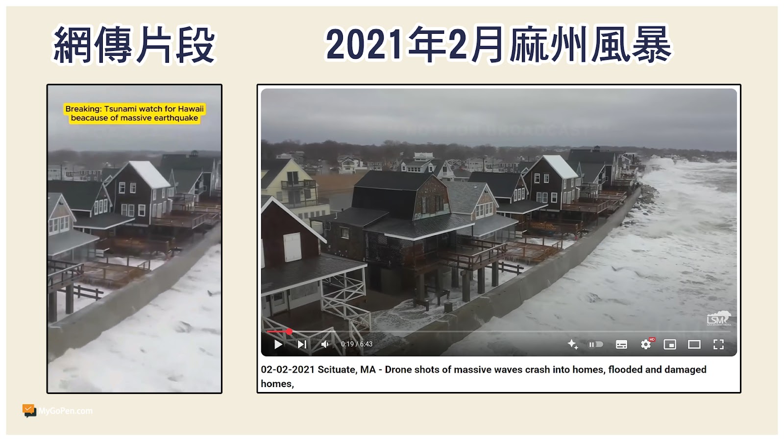 利用 Google Lens 進行反搜,可以找到 YouTube 頻道「Live Storms Media」於 2021 年 2 月 3 日上傳的影片,內容提到美國麻薩諸塞州錫楚埃特(Scituate)受到東北風暴侵襲,長浪衝上堤岸,造成房屋受損。0:19 秒開始的畫面,與網傳片段相同,可以得知片段四與夏威夷海嘯無關。