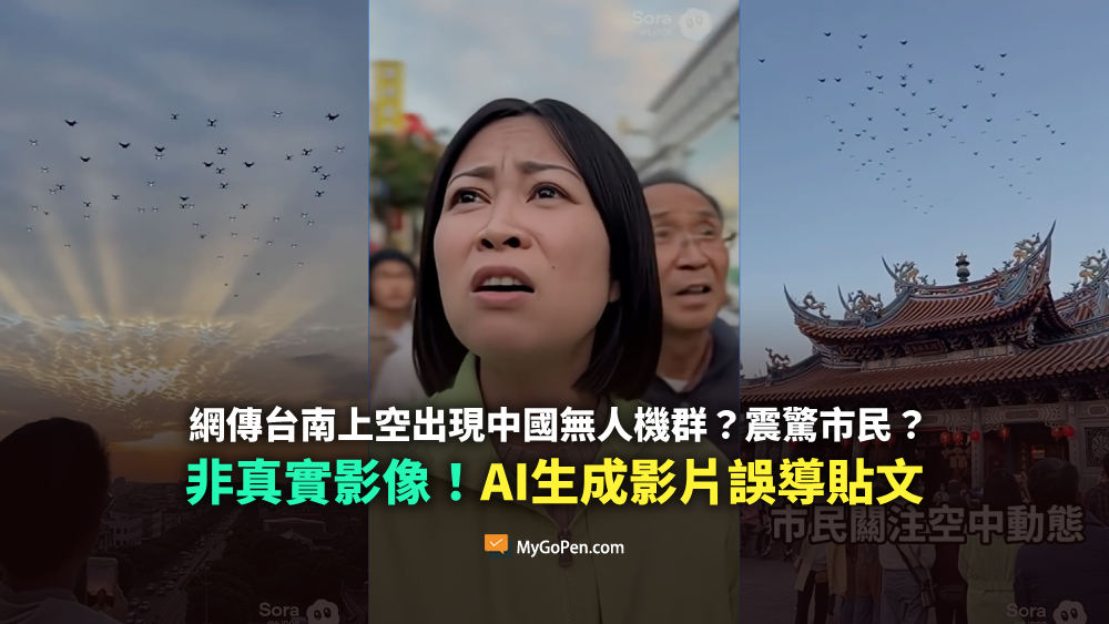 網傳「台南上空出現大陸無人機群,震驚市民,人們議論紛紛」的訊息和影片。經查證,網傳影片是透過 AI 生成工具「Sora」製作,出自發布大量 AI 生成影片的 YouTube 頻道,並非真實畫面,且近期並無大量中國無人機入侵台灣上空的相關報導,傳言為錯誤訊息。