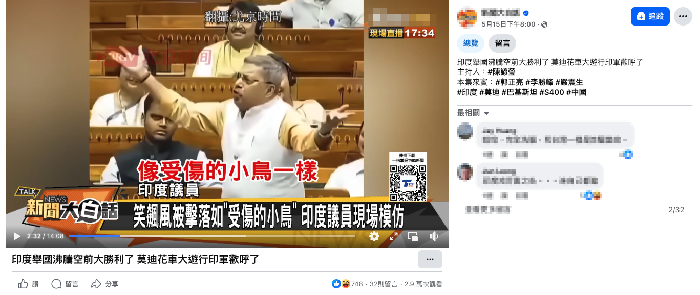 【錯誤】印度議員嘲諷莫迪?飆風被擊落如受傷的小鳥?挪用無關畫面!虛構翻譯