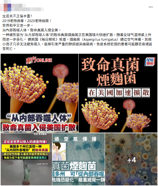 網傳「致命真菌煙麴菌」的貼文及影片,但根據專家說法,「麴菌」常見來源為土壤、落葉等,傳言提到「這回來不及怪中國」、「高碳排恐使歐洲暴露於感染風險中」、「台灣就繼續卯足了勁兒的火力發電」等說法,是沒有科學依據的個人意見與陰謀論說法,為錯誤傳言。