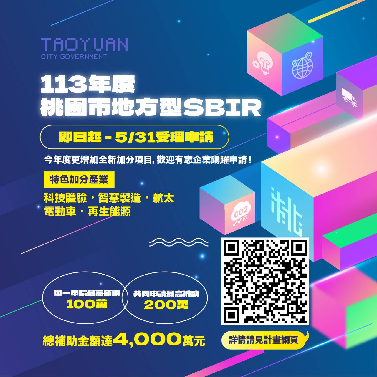 桃園市政府為鼓勵桃園市中小企業加強技術創新研發,加速提升中小企業之競爭力,辦理「地方產業創新研發推動計畫(地方型 SBIR)」,最高補助新台幣200萬元整(單一申請最高補助100萬元;共同申請最高補助200萬元),受理收件期間自即日起至113年5月31日止。