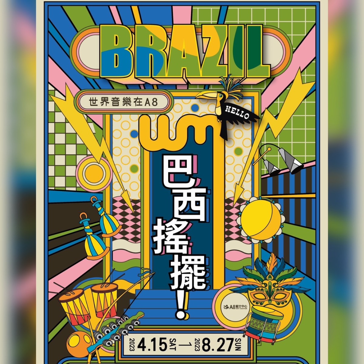 桃園A8藝文中心舉辦《世界音樂在A8》的年度特色主題展,持續擁抱來自世界的聲音,今年將穿越熱情奔放的拉丁美洲,於4月15日(星期六)至8月27日(星期日)盛大舉辦「世界音樂在A8—巴西搖擺!」特展,引入巴西多樣曲風、舞蹈及生活日常作為展覽主題,帶領觀眾一探巴西音樂與文化的歷史堆疊與深遠記憶,一窺熱情澎湃的背後是如何舞出自由奔放的舞步。
