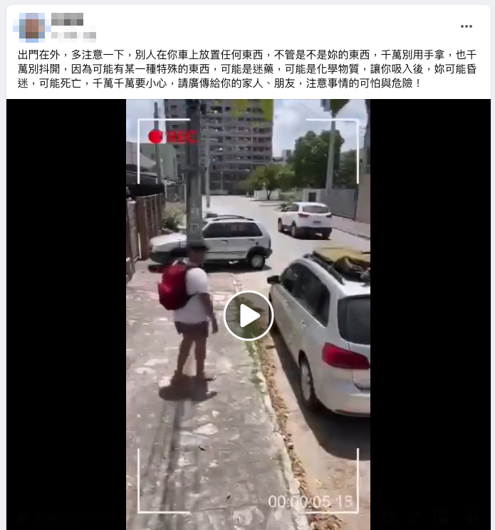 【錯誤】網傳影片:別人在你車上放東西千萬別拿,可能是迷藥?情境劇誤導
