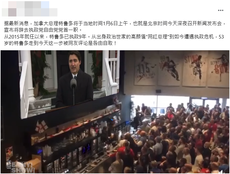 網傳「根據最新消息,加拿大總理杜魯道將於當地時間1月6日上午,也就是北京時間今天深夜召開記者會,宣布將辭去執政黨自由黨黨首一職」的訊息,和一則民眾看到杜魯道請辭後歡呼的影片。經查證,傳言影片中的大螢幕畫面是被後製替換,原畫面其實是 2016 年歐洲盃足球賽時,英格蘭隊踢出關鍵致勝球,戰勝威爾士隊;加拿大總理杜魯道主政近 10 年,但近年民調因房價、物價、移民等社會問題不斷下跌,且自由黨內也掀起反對杜魯道繼續擔任黨魁的聲浪,當地時間 2025 年 1 月 6 日,杜魯道宣布請辭,轉任看守總理,直到自由黨選出繼任者。