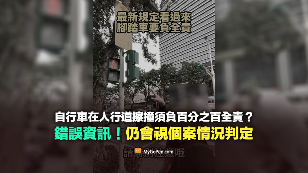 【錯誤】自行車在人行道擦撞須負百分之百全責?不實說法!仍會視個案情況判定