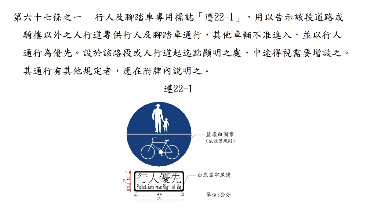 警方表示,依據《道路交通標誌標線號誌設置規則》第 67 - 1 條規定「行人及自行車專用標誌『遵 22 - 1 』,用以告示該段道路或騎樓以外之人行道專供行人及自行車通行,其他車輛不准進入,並以行人通行為優先。」