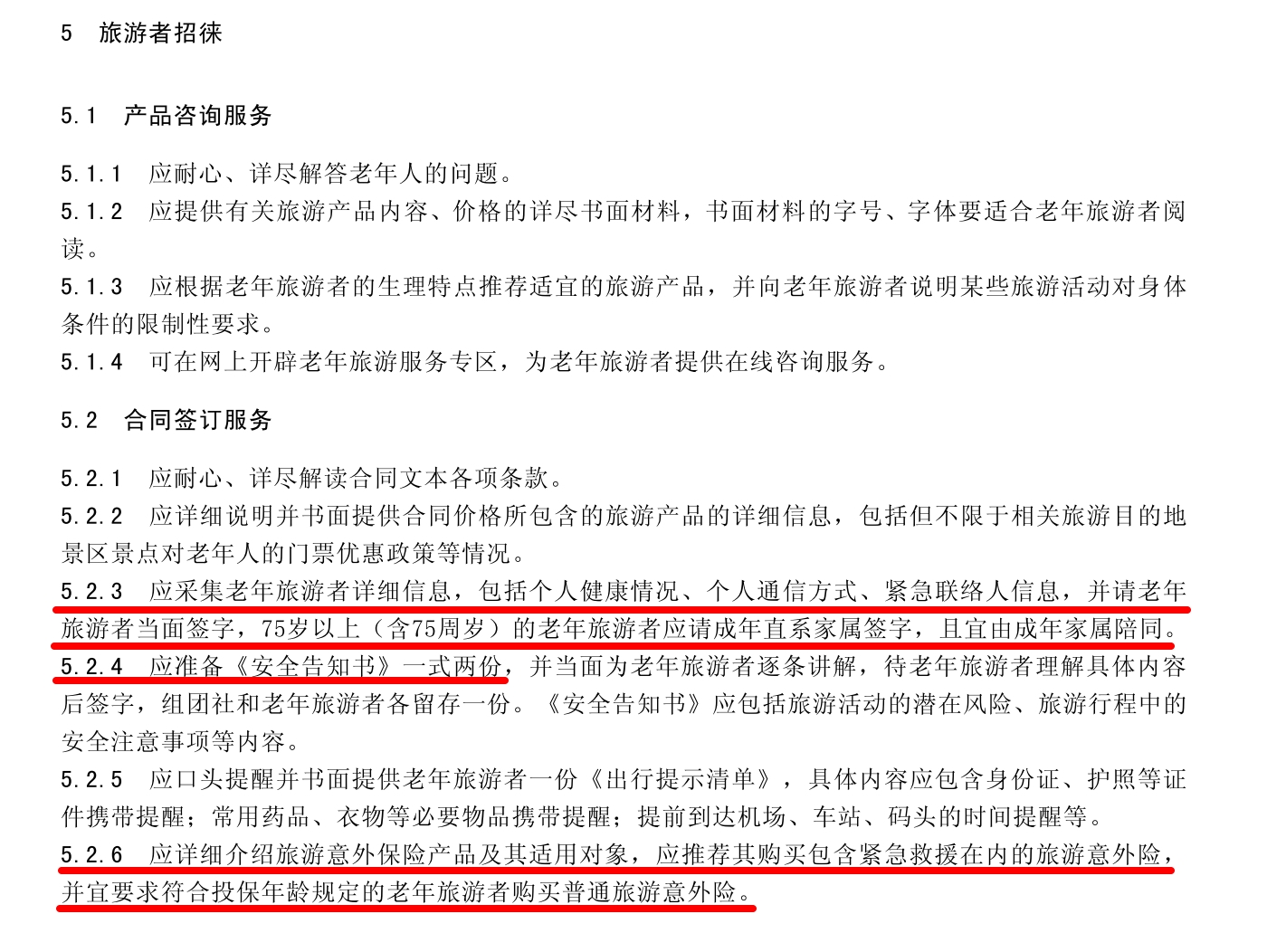 其中第 5 條第 2 項第 3 款規定「應採集老年旅遊者詳細信息,包括個人健康情況、個人通訊方式、緊急連絡人信息,並請老年旅遊者當面簽字, 75 歲以上(含 75 周歲)的老年旅遊者應請成年直系家屬簽字,且宜由成年家屬陪同。」
