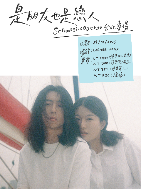 來自南京的樂團 Schoolgirl Byebye 日前無預警宣布將在 10 月 29 日於台北 CORNER MAX 舉辦專場「是朋友也是戀人」,且公布即開賣,這也是他們自 2015 年成軍以來首次來台演出。消息一出令許多台灣歌迷驚喜萬分,開賣當晚所有票種就迅速售罄,足可見他們現今的高人氣,不少人因為專場訊息來得突然,錯失搶票良機,扼腕不已。