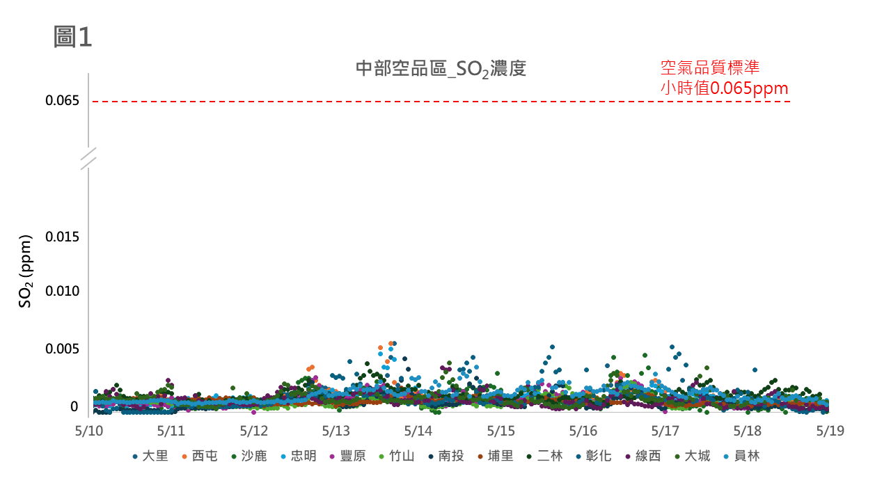 不過,環境部大氣環境司於 5 月 19 日有作出澄清,表示在調閱 5 月 10 日至 18 日中部空品區空氣品質監測站數據後,發現二氧化硫(SO₂)、二氧化氮(NO₂)與細懸浮微粒(PM 2.5)濃度均無明顯增加及變動趨勢,且該時段二氧化硫及二氧化氮的 AQI 指標屬於「良好」等級;PM 2.5 的 AQI 指標則介於「良好」至「普通」等級,環境上無明顯影響變化。