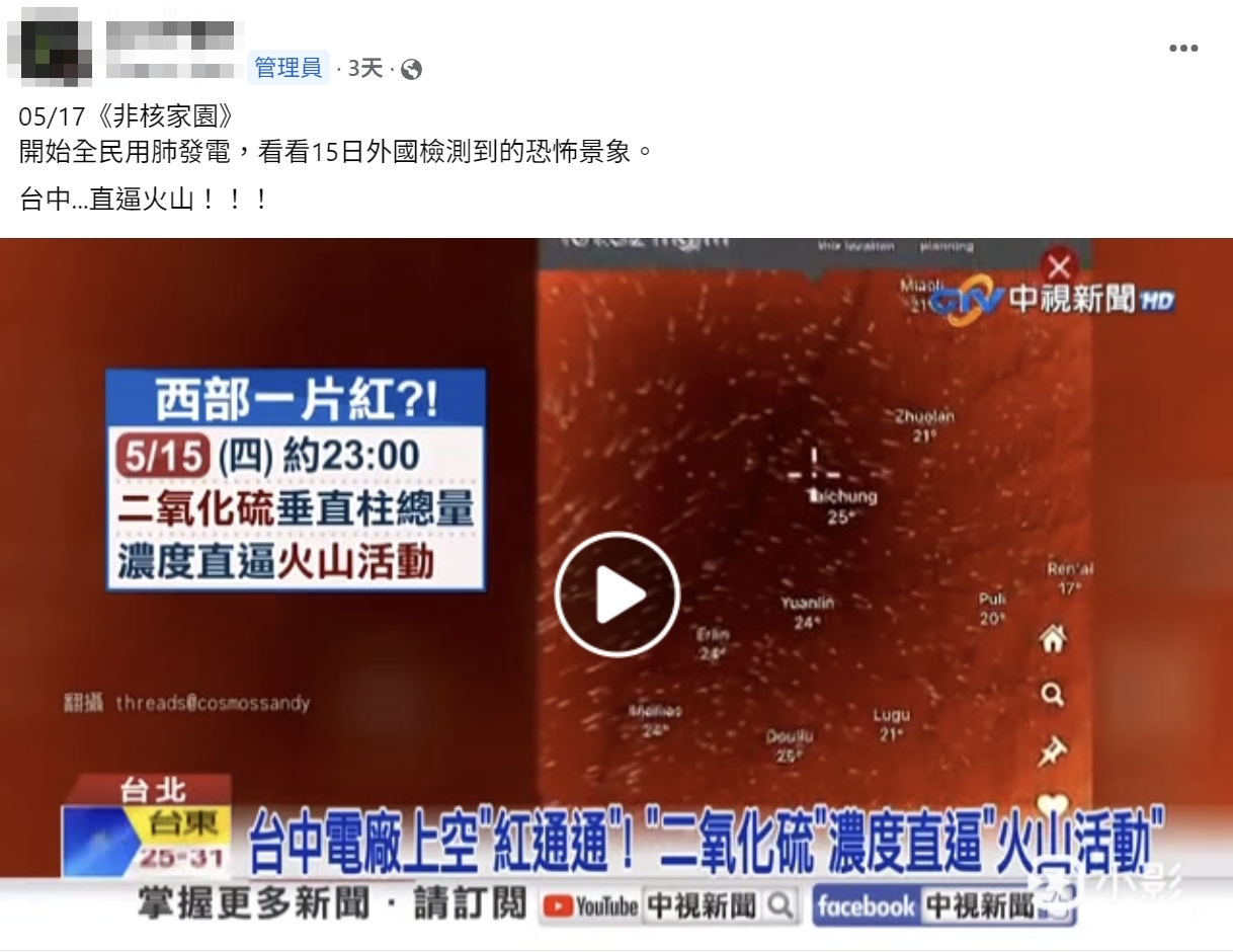 網傳「台灣空中紅通通」的影片及訊息,內容聲稱有民眾發現台中在 5 月 15 日晚間,二氧化硫(SO₂)濃度異常高,整個呈現紅色情況,懷疑是發電廠所致。經查證,網傳圖片來自氣象預報網站 Windy,該網站使用美國太空總署(NASA)的大氣建模系統「GEOS-5」,並根據過往排放資料做出推估,並非實時監測數據。環境部表示,調閱 5 月 10 日至 18 日中部空品區空氣品質監測站數據,並未發現二氧化硫濃度增加或是明顯變動的情況;此外,Windy 網站呈現的數據僅為模擬結果,且測量數據為「總氣柱含量」,單位是毫克/每平方公尺(mg/m²),與台灣地面空氣品質監測站所量測的「地面濃度」(單位為 ppm),無法直接對應或比較。網傳訊息把預測數據當成是實時監測數據,容易造成民眾誤解。
