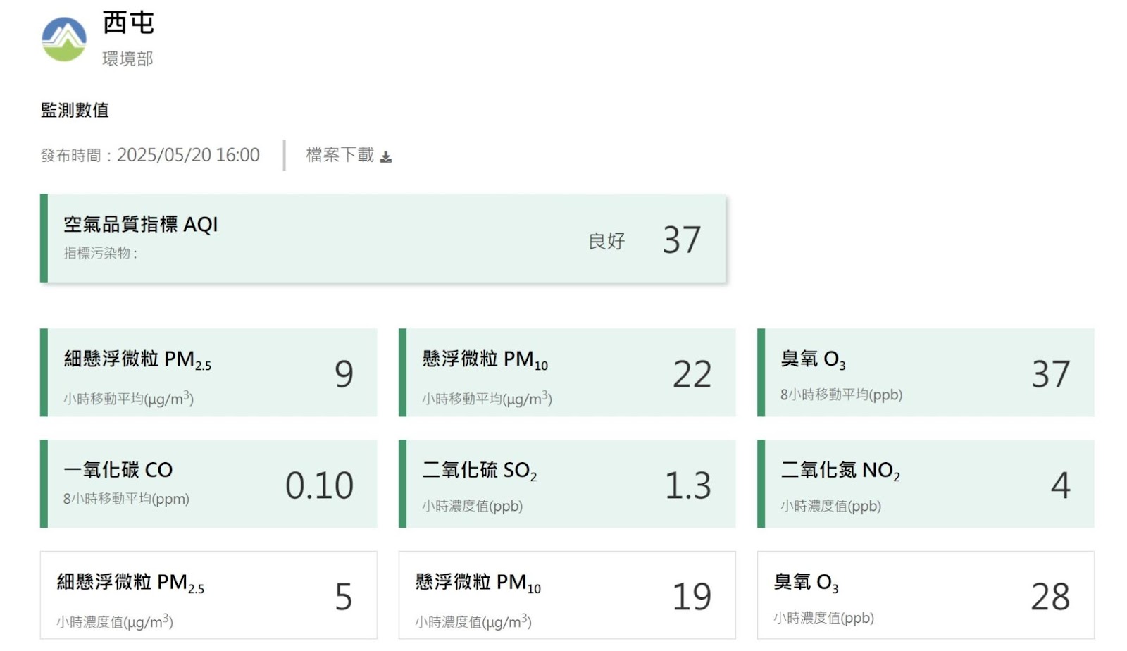 檢視環境部「空氣品質監測網」的公開數據,以 2025 年 5 月 20 日16:00 來看,西屯檢測站測得的二氧化硫為小時 1.3 ppb,空氣品質指標(AQI)屬於「良好」,不過該網站最多只能查詢 3 天前的數據,無法確認網傳圖片發布時(5 月 15 日)二氧化硫的排放情況。