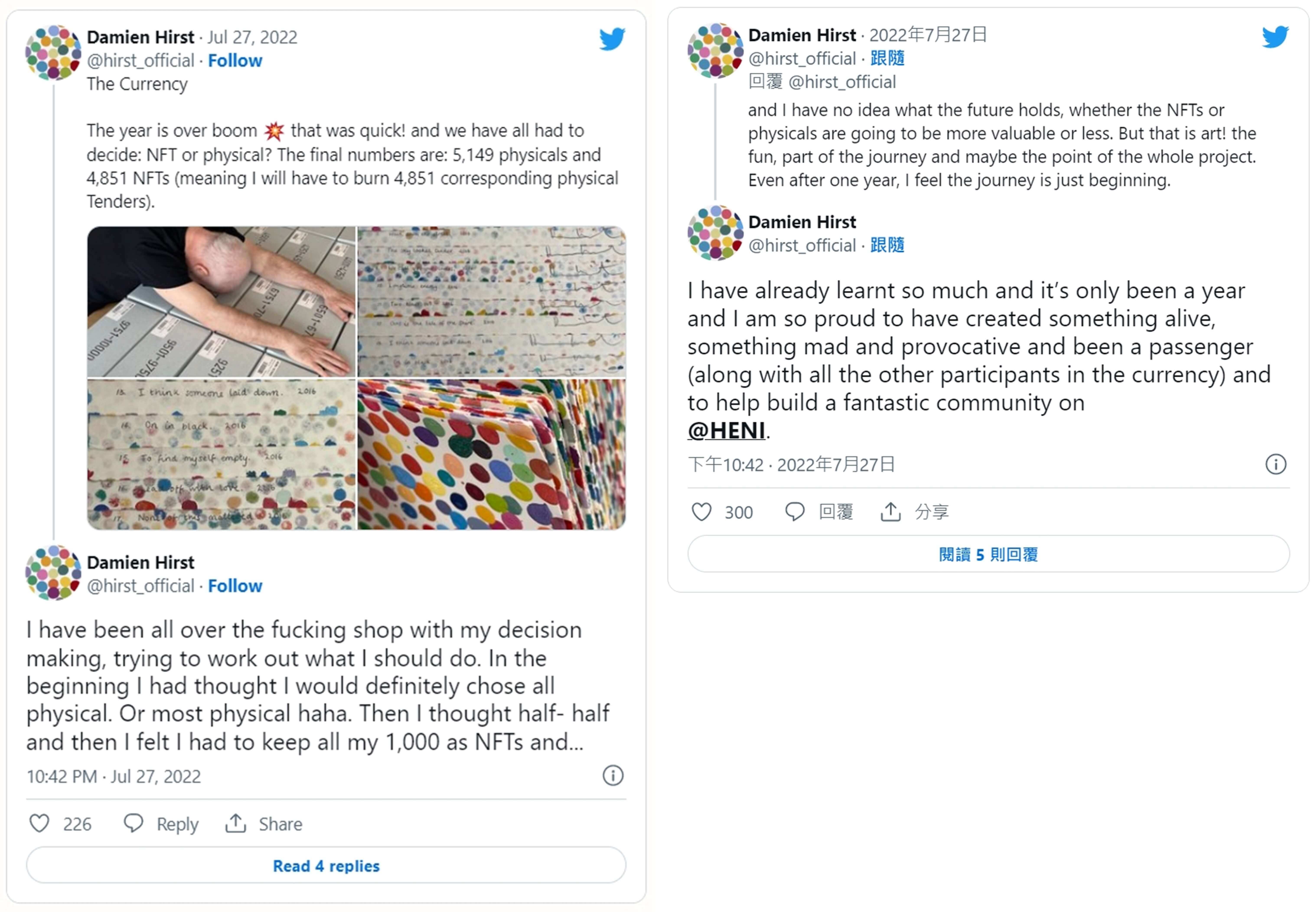 Hirst公布了原始買家們的選擇。得到了「4,851位買家希望保留NFT」和「共有5,149位買家希望換取實體畫作」的結論。如同Hirst最初在twitter上所公布的結果,他將不得不燒毀4,851幅實體畫作。