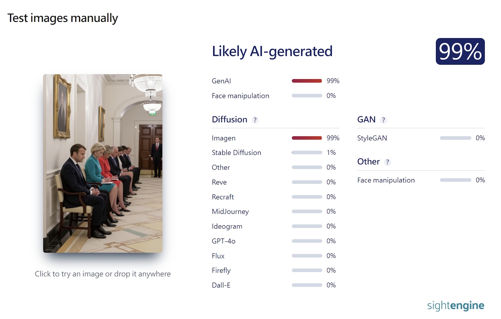 利用 AI 影像偵測工具「HIVE Moderation」、「Sightengine」、「WasItAI」等進行檢測,發現圖片是由 AI 生成的機率皆超過 99%。