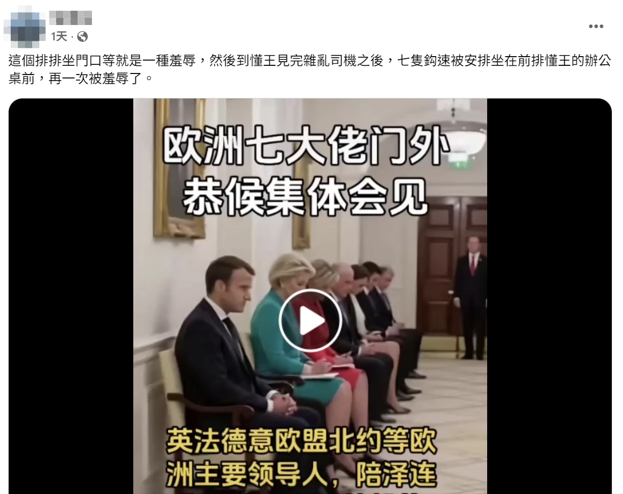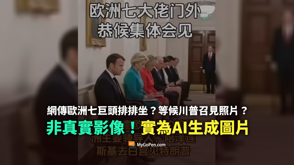 網傳「歐洲領導人排排坐」的圖片及訊息,內容聲稱美國總統川普於 2025 年 8 月 18 日與烏克蘭總統澤倫斯基及歐洲重要領導人會面,有攝影師拍下法國總統馬克宏、歐洲執委會主席馮德萊恩等 7 名政要坐在會議室外頭,等待川普召見的畫面。經查證,網傳圖片中的人物不僅手指模糊、多一隻腳,地板也出現紋路不連貫等特徵,利用多個 AI 偵測工具進行檢測後,確認網傳圖片為 AI 生成影像,並非歐洲領導人與川普會面時的照片,網傳訊息不正確。