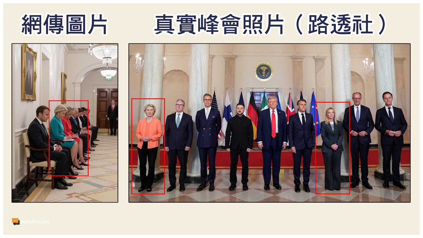 以「EU Trump meeting」等關鍵字進行搜索,可以找到 NBC News、路透社(Reuters)等媒體的報導,皆有放出美國總統川普與烏克蘭總統澤倫斯基、歐洲領導人及歐盟高層的合照,可以看到馮德萊恩(左一)當天是穿著橘色上衣,另一名女性是義大利總理梅洛尼(右三),穿著深色西裝,實際穿著打扮與網傳圖片皆不相同。