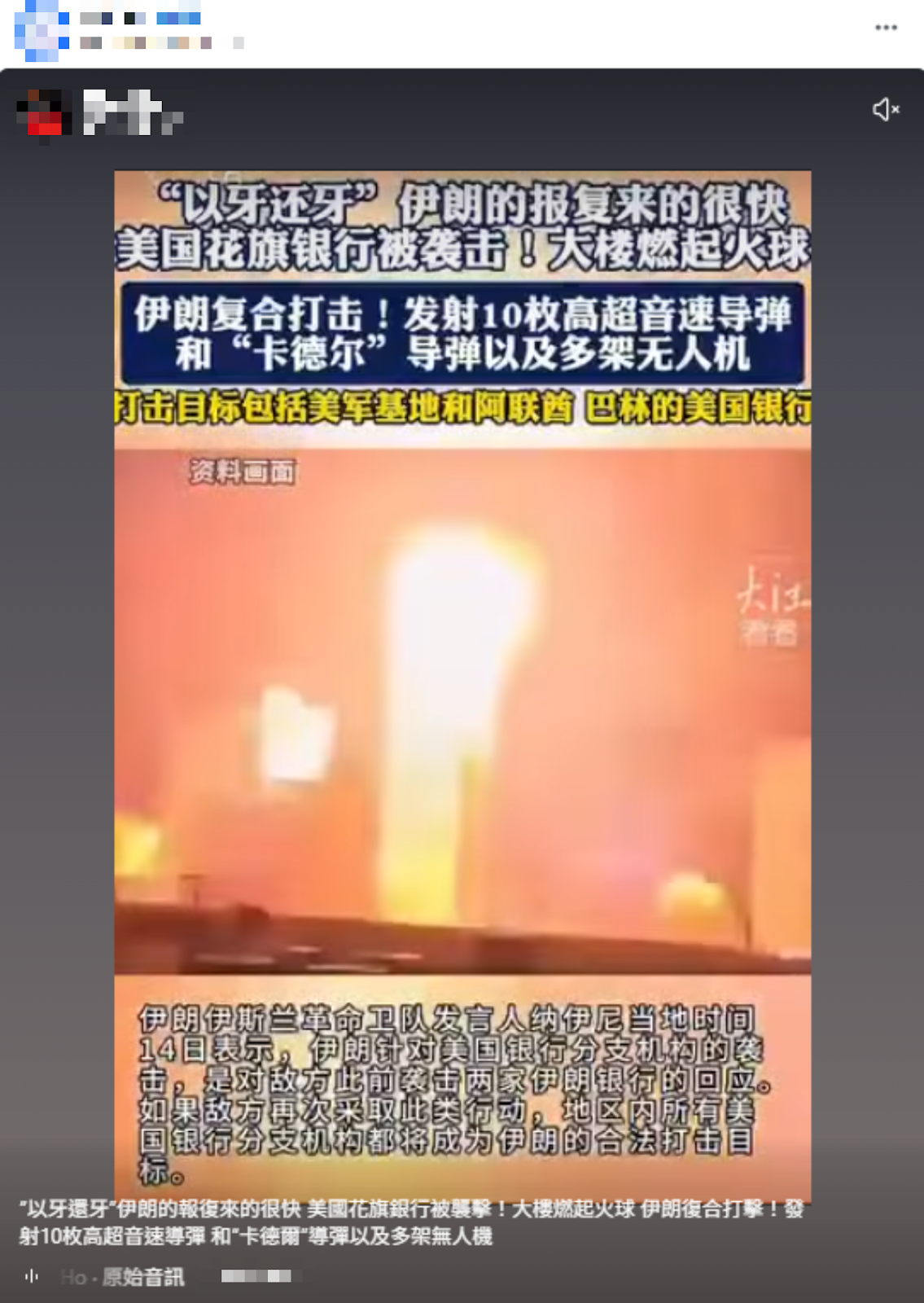 網傳「伊朗的報復來的很快」、「美國花旗銀行被襲擊」的訊息和影片。經查證,傳言影片實為巴林的住宅大樓 Era Views Tower 被伊朗無人機攻擊,該事件造成至少 1 人死亡、8 人受傷;美國花旗銀行已針對其辦公室和分行遭受攻擊的傳言進行回應,表示其為虛假說法,目前花旗銀行在中東地區的分行暫未受到伊朗襲擊,傳言說法為錯誤訊息。