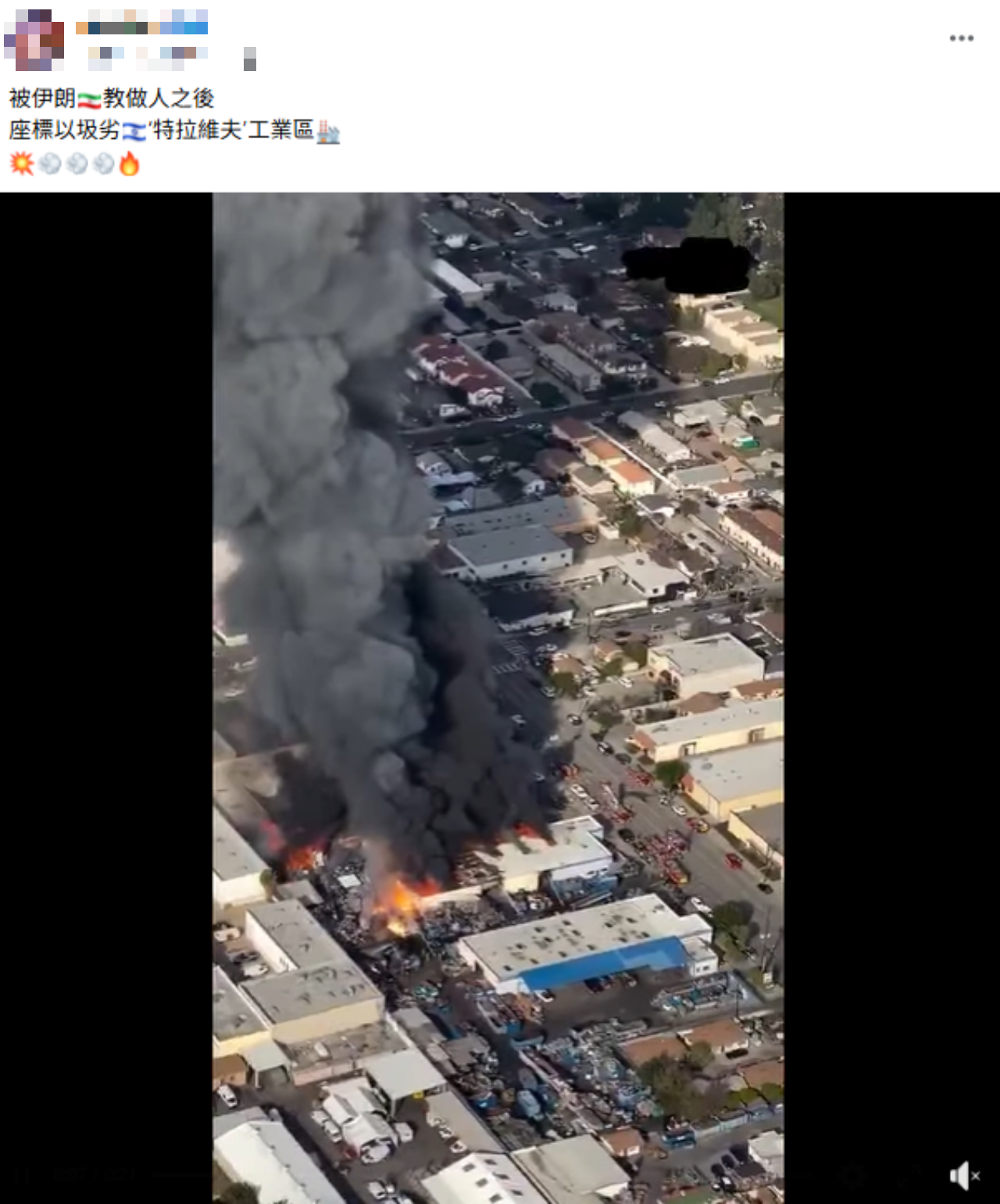 網傳影片是加州南埃爾蒙特市一家金屬加工廠發生火災的畫面,不是以色列特拉維夫的工業區,傳言為錯誤訊息;近日以國南部內歐特霍瓦夫工業區在伊朗攻擊後有發生火災,疑似是因為攔截伊朗飛彈的碎片所引起。